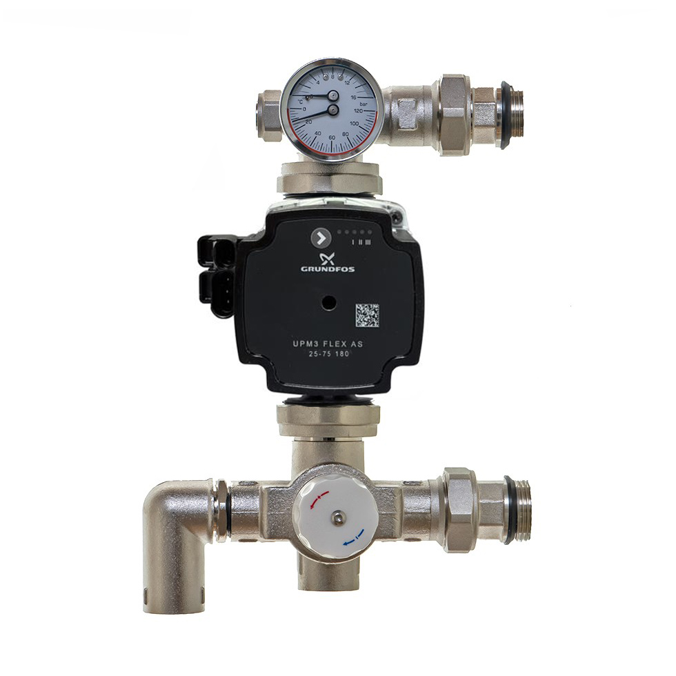 Grundfos A rated easy fit pump pack is an all in one mixing/blending valve, inlet connections and pump assembly. This pump pack saves the installer having individual connections between manifold/pump/blending valve etc.